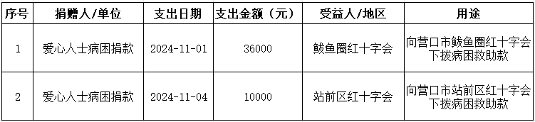 营口市红十字会2024年11月份捐款支出共2笔,总计4.6万元,明细如下: