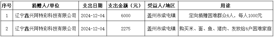 营口市红十字会2024年12月份捐款支出共2笔,总计8275元,明细如下:
