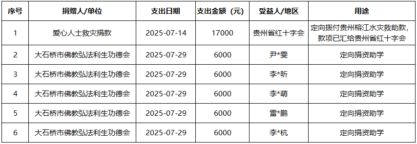 营口市红十字会2025年7月份捐款支出共6笔,总计4.7万元,明细如下: