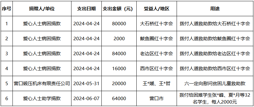 营口市红十字会2024年第二季度捐款支出共6笔,总计26.6万元,明细如下: